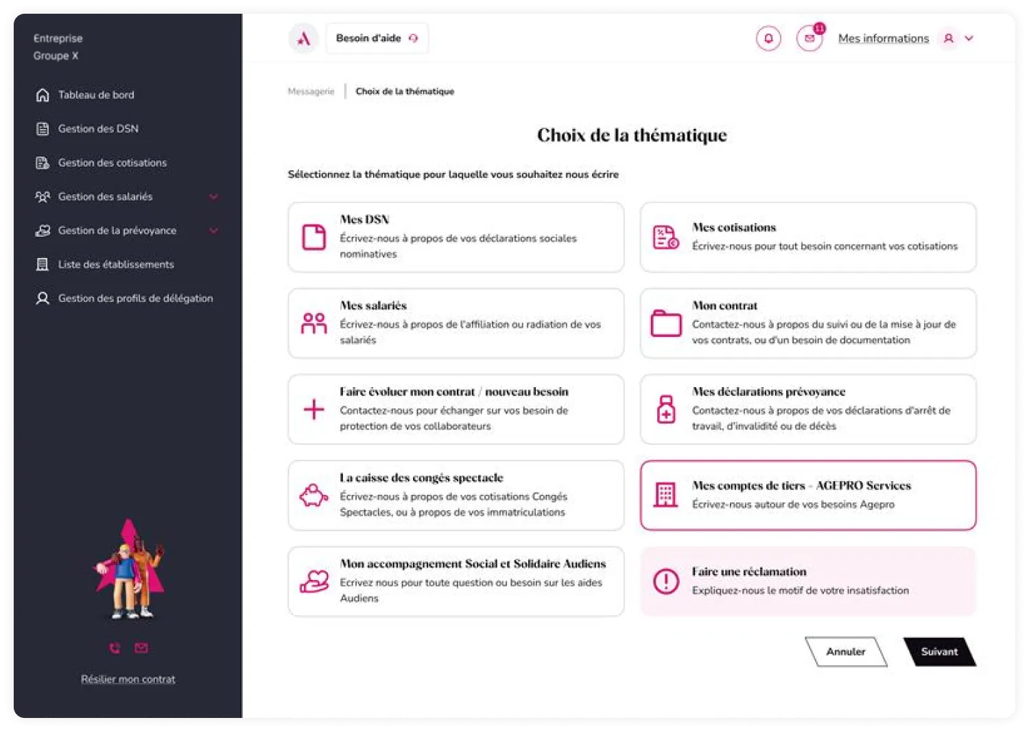 - Choisissez l’objet précis de votre demande (vos cotisations, votre contrat, vos salariés…) grâce à un affichage clair et pédagogique.