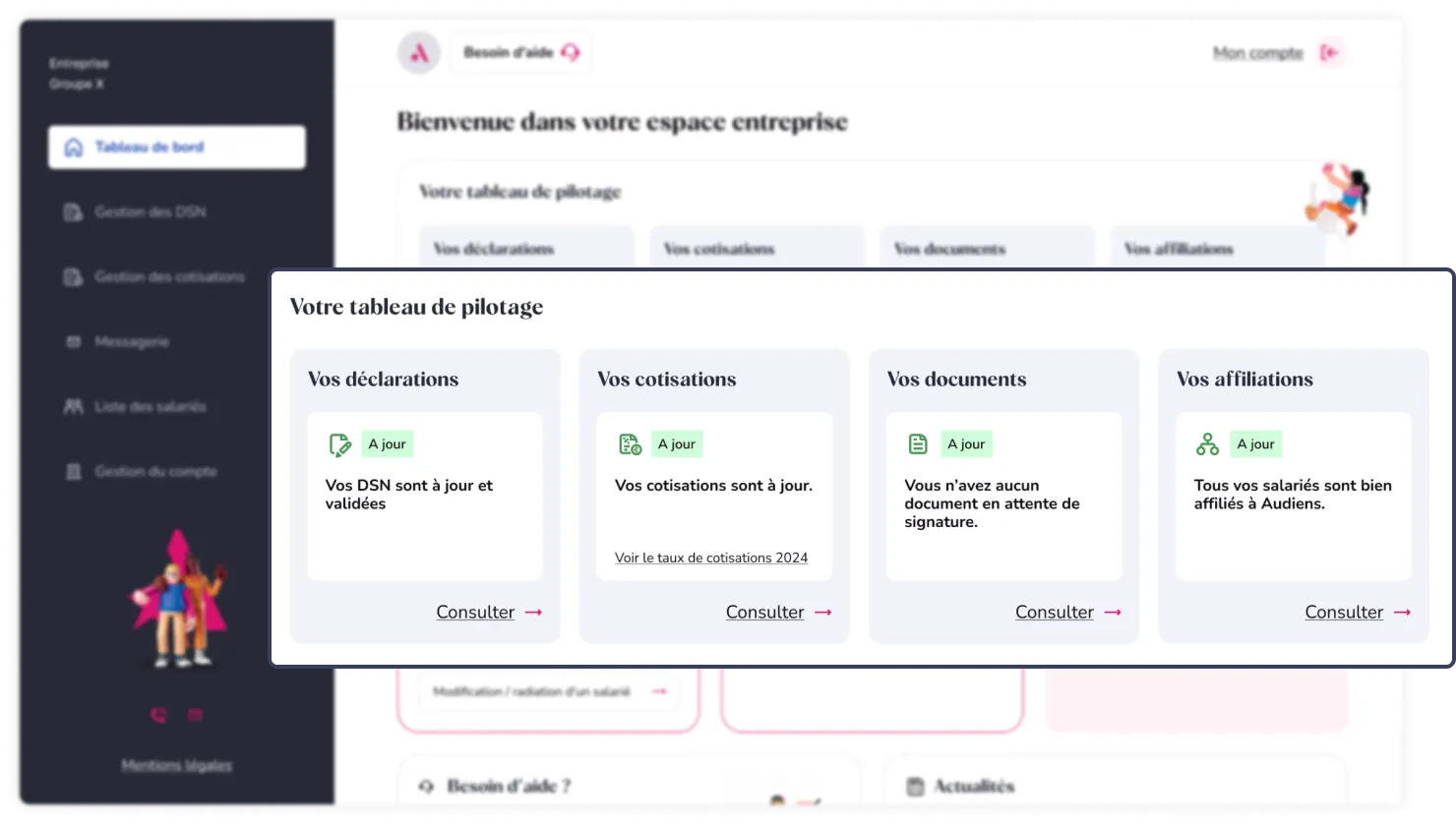 À noter : recevez des alertes sur les soldes de cotisations à régulariser, les documents à signer et même les affiliations à valider, et accédez aux dernières actualités.
